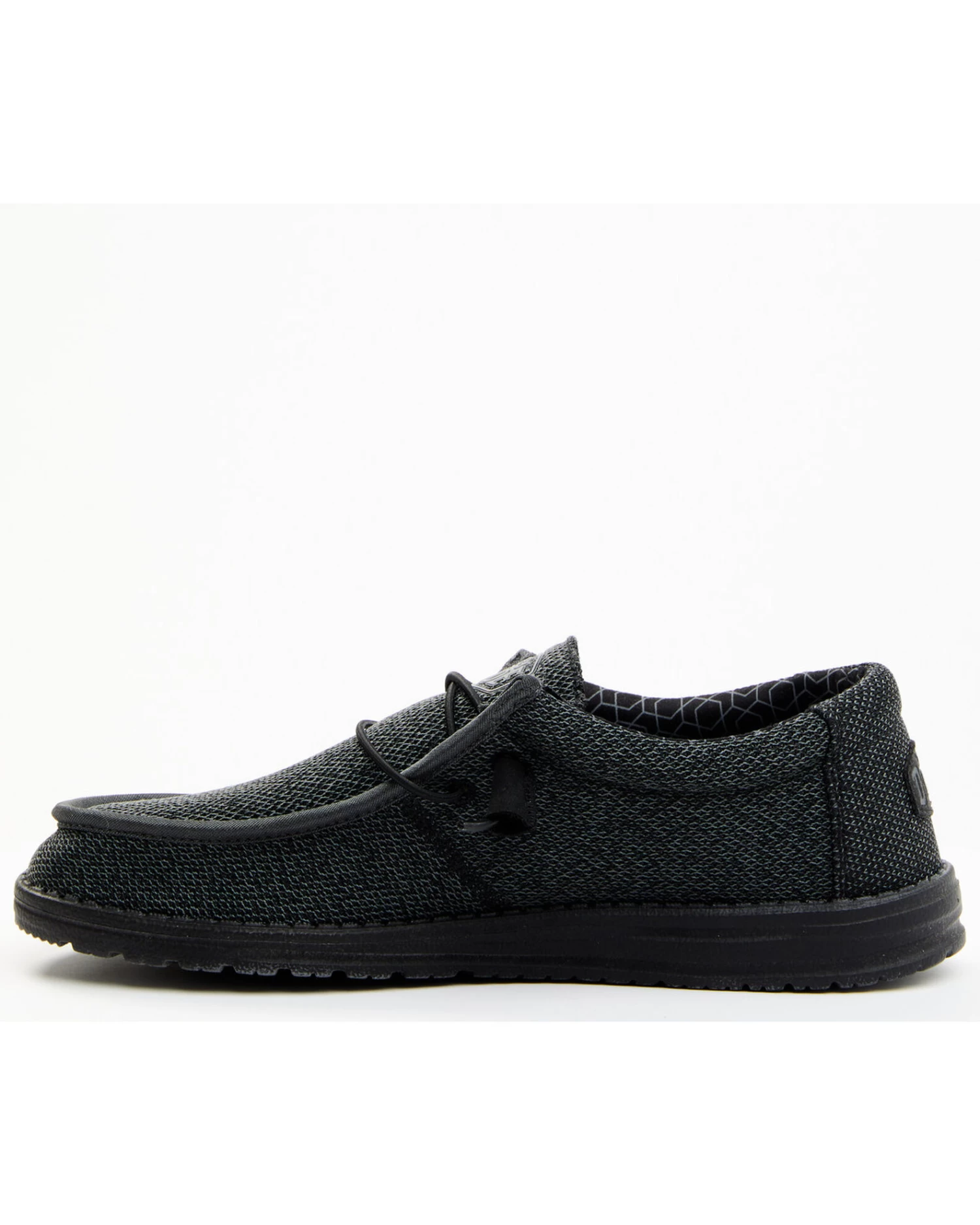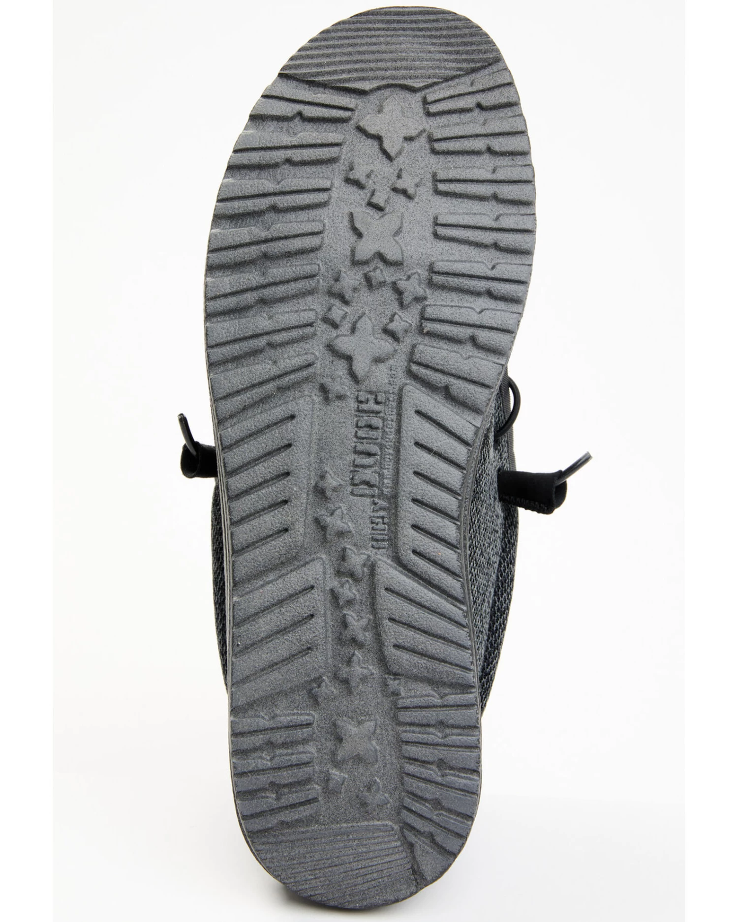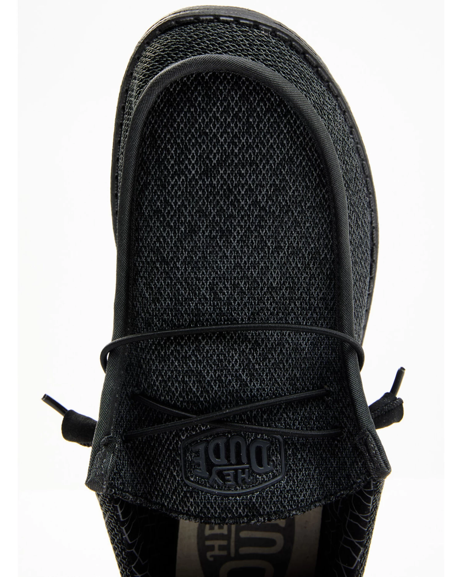 - Solid black design with HEYDUDE logo patch on heel